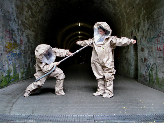 Die Schutzanzüge rufen bei jedem Betrachter, beeinflußt durch Kindheitserinnerungen,
